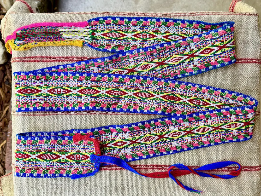 Chumpis are traditional belts woven with bright colors and geometric patterns. They are small but meaningful examples of Andean textile craftsmanship.