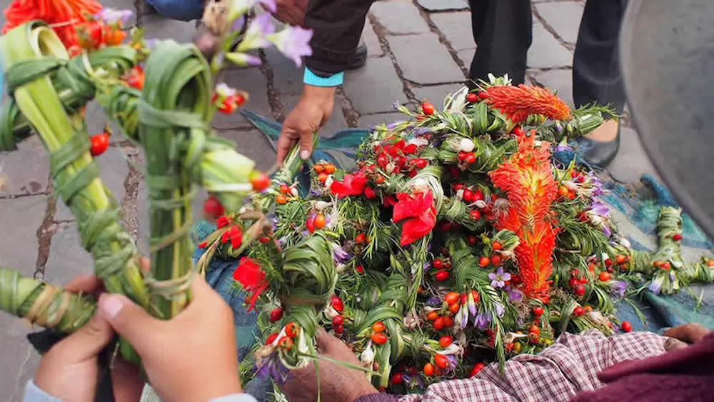 Palm Sunday officially begins holy week in Cusco. Early in the morning, locals gather outside churches such as Cusco Cathedral, San Pedro, and San Blas, carrying palm leaves, olive branches, and woven crosses made from local plants.