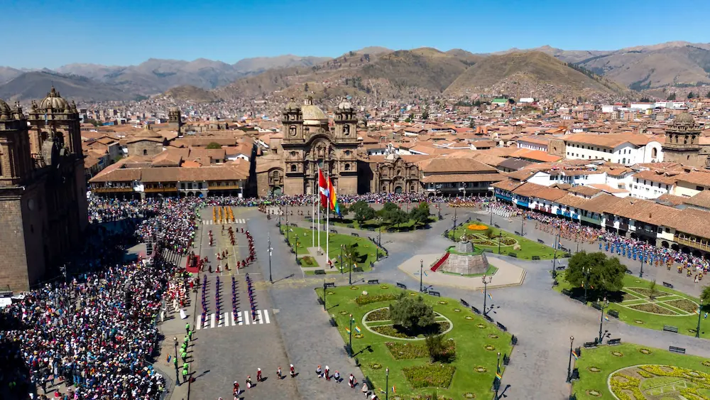After the rituals at Qoricancha, the festival moves to Plaza de Armas, Cuscoâs central square. Here, a public procession unfolds for about one hour, featuring traditional dances and music. Performers wear colorful costumes representing the Inca hierarchy, while musicians play pututus, drums, and flutes, creating a lively and immersive atmosphere.